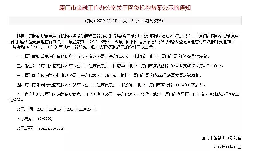 值得注意的是,当年5月9日,厦门金融办在其官网发布《关于进一步于进一步推动网络借贷信息中介机构清理的通告》,要求对“2016年8月24日后新设立的网贷机构或新从事网络借贷业务的网贷机构,在本次网贷风险专项整治期间,原则上不予备案登记”,并随文发布了不予备案验收备案的第一批440家网贷机构名单。但于2017年9月底成立的京东旭航(厦门)网络借贷信息中介服务有限公司,并不在这440家不予备案的网贷机构名单之列内。