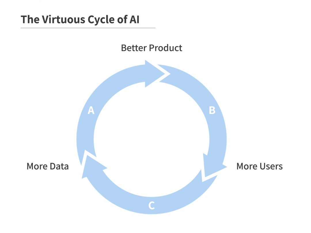 根据「AI 良性循环」设计反馈积极的策略:在许多产业,我们可以看到数据积累会带来壁垒业务: