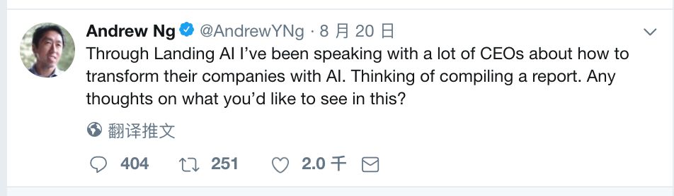 CEO 们应该如何借助 AI 对自己的企业进行转型?吴恩达在今年 8 月份时曾发布 Twitter 表示在与众多 CEO 交流过后,将会发布一个面向公司管理层的报告介绍 AI 产业转型。作为斯坦福大学的教授,在线课程 Coursera 的发起者,吴恩达这次准备以教育者的身份将「All in AI」的经验传授给众多公司管理者们。