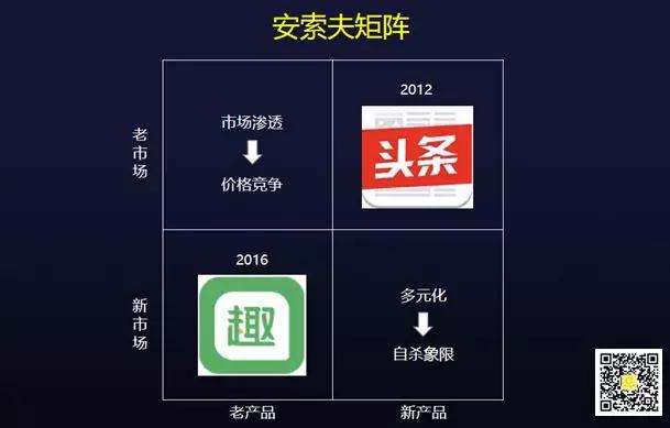 依然回到安索夫矩阵,趣头条用一个老产品进入了全新的市场,接下来如果它在这个市场能够站住脚跟,是会用同样打法进入一二线市场,还是在下沉市场去做一个全新的产品?你看,这也是一个看上去很难回答的问题。