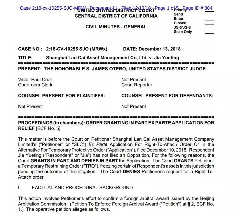 法官S·詹姆斯·奥特罗(S.James Otero)周四批准了上海懒财资产管理公司的请求。他写道,鉴于《承认及执行外国仲裁裁决公约》(又称《纽约公约》,是100多个国家之间达成的一项跨国承认仲裁裁决的协议)的相关条款,联邦法院“非常有可能确认”仲裁裁决。