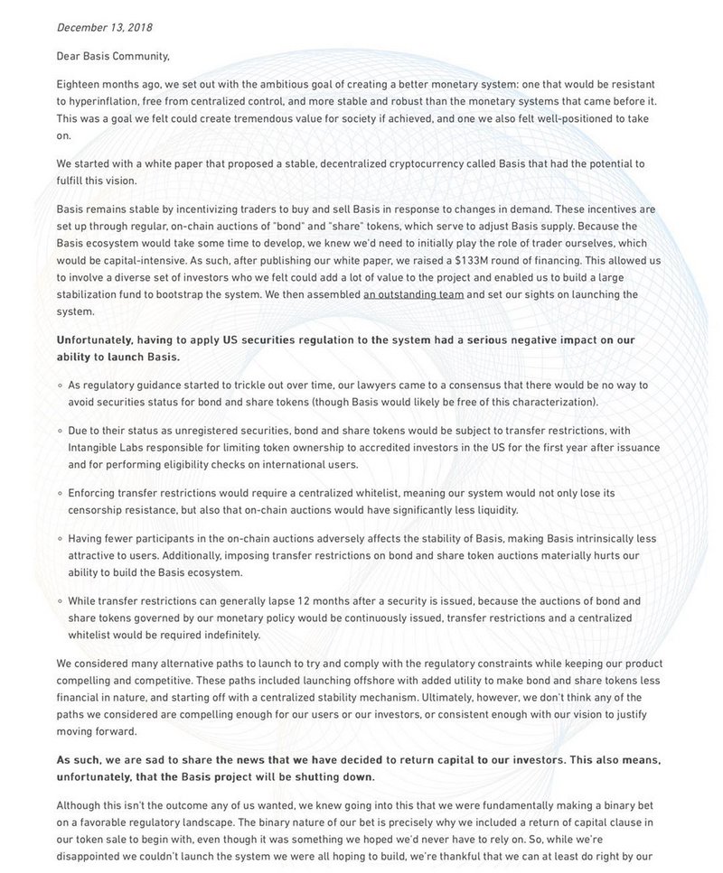 而针对此前报道留下监管压力来自何方的问题,信中也指出,正是因为美国证券法的监管,对于 Basis 产生了负面影响,暗示其监管机构为美国证券交易委员会(SEC)。