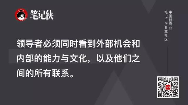 其中最重要的一条是,领导者必须同时看到外部机会和内部的能力与文化,以及他们之间的所有联系。