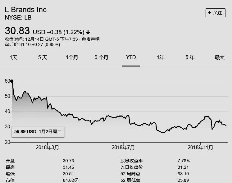 据时尚头条网监测,L Brands现在的股价是2015年最高峰的三分之一,约30美元,近一年来已累积下滑逾50%,目前市值约为84亿美元。