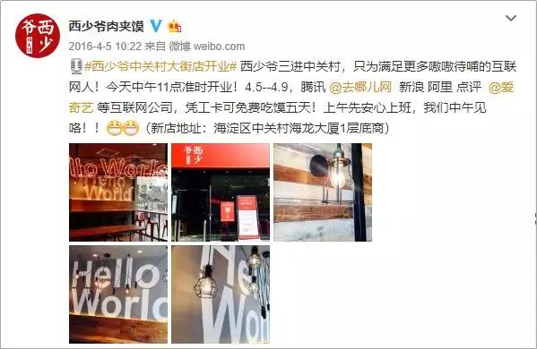 这家肉夹馍店新店开业时,邀请中关村的“部分”互联网公司员工,凭工卡免费吃馍五天。微博里未给出公司的全部名单,而是巧妙地用一个“等”字规避限制,给自己留下可发挥的空间。
