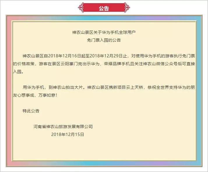 原来,是河南一个叫“神农山”的景区,将于 2018 年 12 月 16 日至 12 月 29 日,对使用华为手机的游客执行免门票(原价 65 元)的政策。
