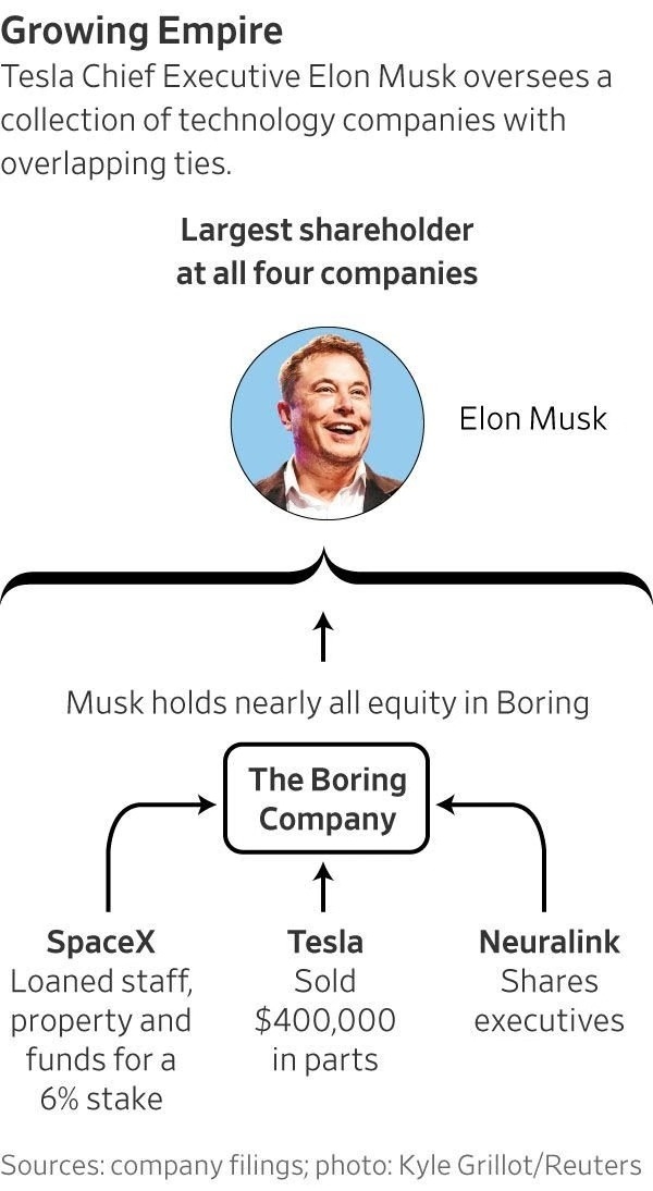 图示:Space X向Boring提供场地、时间、员工等资源,换取了6%的Boring股票;特斯拉向Boring公司卖了40万美元零部件;而Neuralink的总裁也是Boring公司领导人。