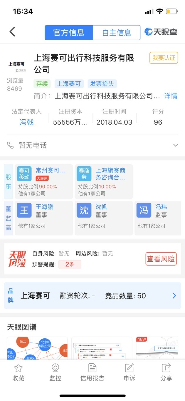 《每日经济新闻》记者了解到,“享道出行”运营主体为上海赛可出行科技服务有限公司(简称“赛可出行”)。天眼查显示,“赛可出行”注册时间为2018年4月3日,注册资本5.5556亿元,董事长、总经理由上汽旗下产业资本——上海尚颀资本执行事务合伙人委派代表冯戟担任。