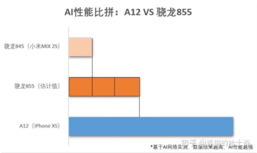 结果显示,在基于AI神经网络实测的场景下,搭载骁龙845的小米MIX 2S测试数据为10.39,而搭载苹果A12芯片的iPhone XS测试数据为72.64,测试数据越高代表AI性能越强。如果骁龙855的AI性能是845的三倍,那么测试数据应该是31.17,这一数字远低于A12的72.64,但是苹果A12芯片对外公布的AI算力只有5 TOPS。是不是很奇怪?