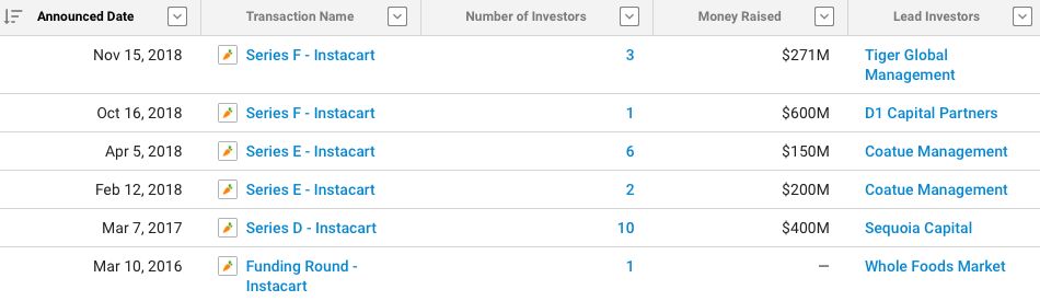 (Instacart 多轮融资情况,数据来源:Crunchbase)