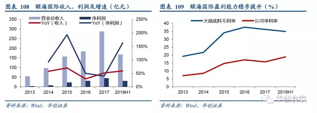 颐海国际:中高端火锅底料龙头,市场份额稳步提升。公司作为国内中高端火锅底料龙头,业绩增长稳健,关联方业务受益于海底捞门店数量和单店收入的增长,有望保持稳健增长;第三方业务在新品开发及渠道扩张带动下,保持高增趋势。2018H1公司实现收入10.0亿元,同增59%,净利润1.85亿元,同增163%。未来随着公司产能稳步释放以及渠道积极开拓,市场份额有望继续提升。