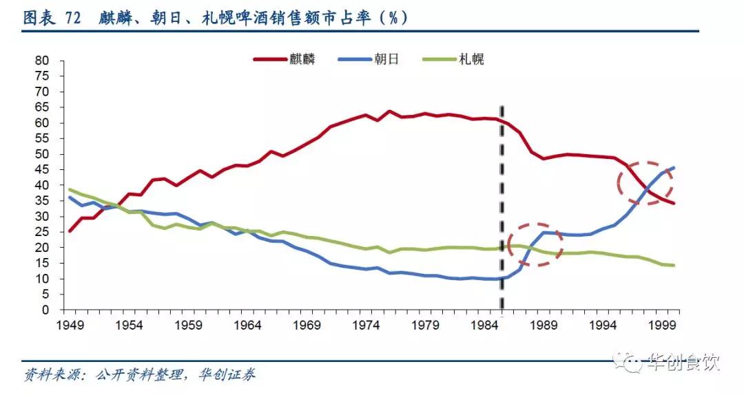 日本啤酒行业集中度较高,麒麟龙头优势明显。日本啤酒行业集中度一直处于相对高位状态,1906年,札幌、日本、大阪合并成为大日本麦酒株式会社,占据日本啤酒市场70%份额。战后基于反垄断考虑,大日本麦酒株式会社被分割为日本麦酒和朝日麦酒,前者旗下有札幌和惠比寿,后者延续其朝日品牌。此后日本啤酒市场三大品牌麒麟、札幌和朝日一直占据90%以上份额,龙头麒麟优势明显,在1972年至1985年间市场份额超过60%,而朝日啤酒经营持续恶化,市占率从1949年的36%下滑到80年代的10%左右。