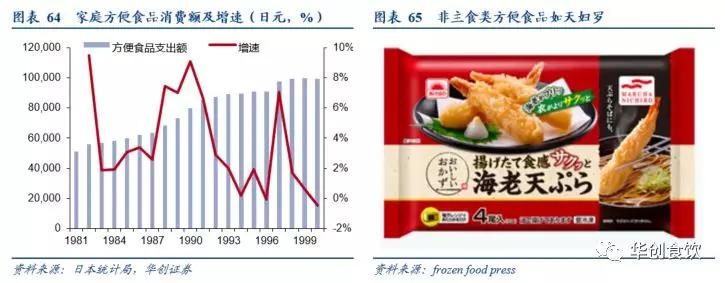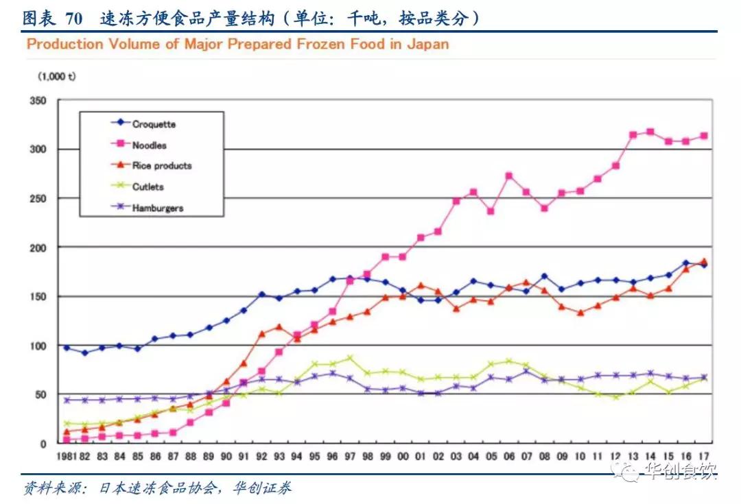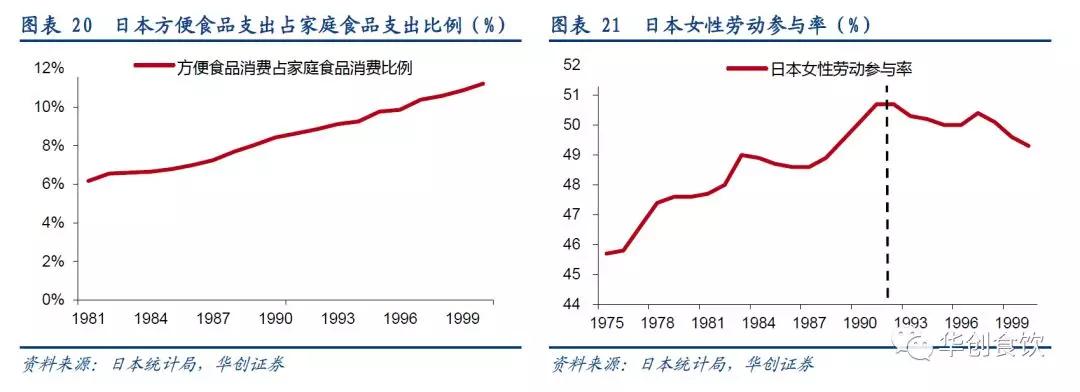 经济波动不改饮食方便化趋势,女性社会化是重要推动因素。日本女性的传统角色是家庭主妇,主要负责在家做饭和从事家务。70年代后日本女性角色由家庭主妇朝职业女性转变,女性在家做饭次数和时长减少,做饭意愿和烹饪技巧逐渐下降。在此背景下,家庭饮食消费朝方便化方向发展。地产泡沫破裂后,部分女性回归家庭,但饮食方便化趋势并未受到经济波动及女性回归家庭影响,预调食品和速冻食品等方便食品支出占家庭食品支出比例从1981年的6.2%持续上升到2000年的11.2% ,主食类方便食品和速冻米面消费稳步增长(下文子行业分析详细说明)。