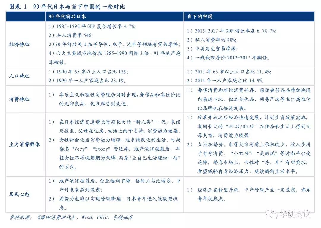 研究的基础在于,当下中国经济与90年代前后日本经济有某些方面的相似之处。1)宏观方面:经济增速放缓,房地产价格处于高位,美国挑起贸易战;2)人口特征:人口老龄化和单身现象加剧;3)消费特征:所谓消费降级与消费升级现象并存,性价比成为趋势;4)消费群体:新一代年轻群体(日本当时的新人类和中国现在的90/00后)及女性群体成为消费主力;5)居民心态:基于对未来预期不明朗,对自身发展和消费选择出现一定焦虑。以史为鉴,居安思危,日本90年代前后的消费变化,对我们看待中国未来消费走势,或许是一面稍显极端但仍有研究价值的镜子。