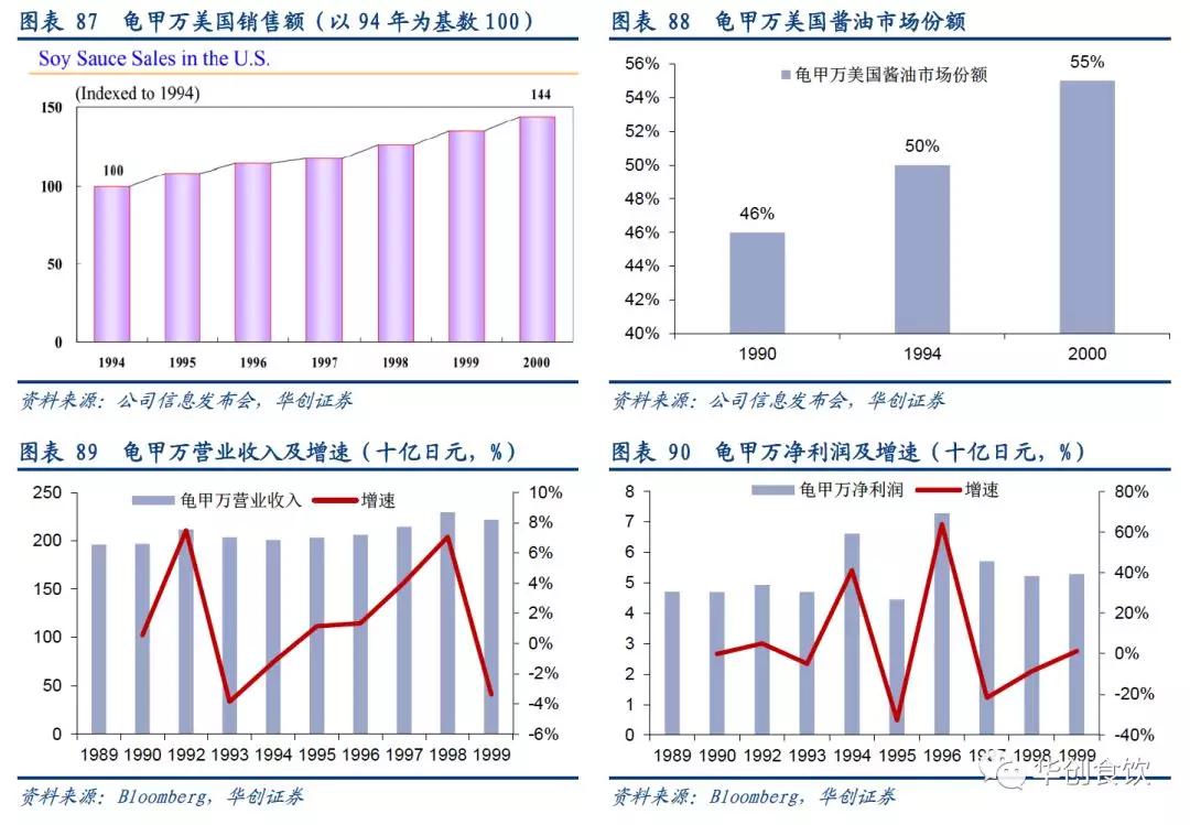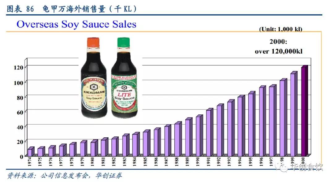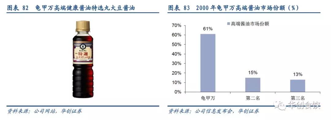 90年代推出高端新品,开创高端健康酱油市场。1990年,龟甲万推出特选丸大豆酱油,该酱油使用营养价值更高的大豆作为原料(之前行业普遍使用脱脂大豆),价格约比普通酱油高30%。1993年,为迎合消费者饮食低盐化需求,龟甲万推出低盐丸大豆酱油,其含盐量比普通酱油减少一半。1998年,龟甲万新品特选有机酱油上市,该酱油使用有机大豆和小麦作为原料,在健康属性上更进一步。到2000年,龟甲万占日本高端健康酱油市场份额高达60%。