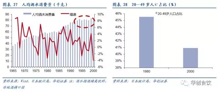 战后随着日本经济高速发展和居民可支配收入提升,酒水消费稳步增长,1965年-1990年间,日本人均酒水消费量从35.9公斤上升到76.1公斤,CAGR为 3.1%。进入90年代之后,日本人均酒水消费量增速放缓,1992年-2000年基本稳定在80公斤左右。一方面,90年代日本老龄化趋势加快,主力饮酒人群占比减少, 20-49岁人口占比从1980年的46%下降到2000年的41%;另一方面,健康意识增强、居民可支配收入下滑、未来预期不明朗等因素也对单价较高的可选酒水消费产生负面影响。