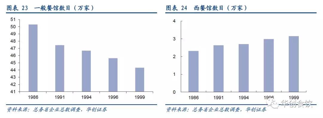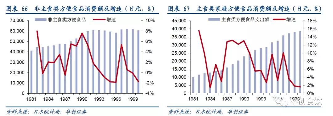 三不变:1)方便化趋势不变。地产泡沫破裂后,该趋势并未受到经济波动影响,如方便食品支出占家庭食品支出比例从1981年6.2%持续提升至2000年11.2%;2)健康化趋势不变。90年代食品饮料子行业朝健康化方向继续升级,如酒精饮料低度化,酱油向低盐有机升级,碳酸饮料消费有所下降但无糖茶饮消费高速增长等;3)西式化趋势不变。经济波动带来居民外出就餐减少,一般餐馆数目从1986年的50.3万家下降到1999年的44.3万家,但并未改变日本整体饮食西式化趋势,西餐馆数目稳步增加,西式调味品等需求稳中有增。