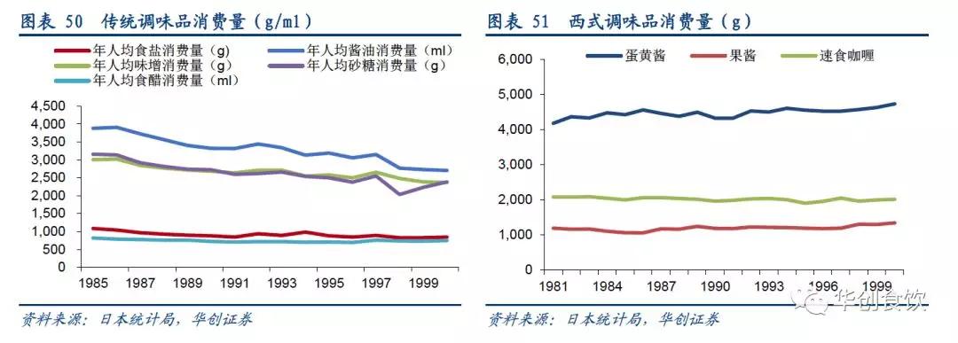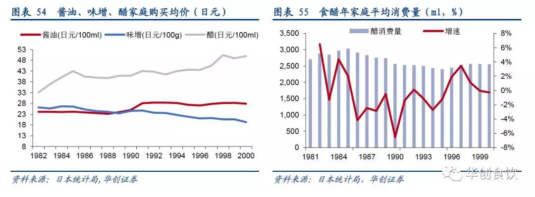 酱油朝健康化升级,食醋价格稳步提升。20世纪80年代初期,日本酱油主要以脱脂大豆作为加工原料,产品均价在24日元/100ml左右。90年代前后,日本酱油行业进行产品健康化升级,用全大豆替代脱脂大豆作为原料,氨基酸含量提升,其购买均价提升到28日元/100ml,并在90年代期间保持稳定。此外,由于食醋具备抗疲劳、降血压血脂、促消化等保健属性,食醋产品均价则从1990年的40.9日元/100ml提升到2000年的50.0日元/100ml。