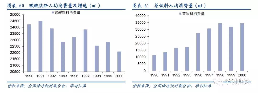 2、碳酸饮料消费下滑,健康茶饮和瓶装水快速增长