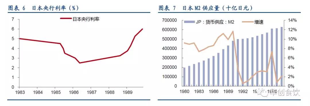 1986年后日本实施扩张性货币政策,地产、股市泡沫高企。1985年《广场协议》签订之后,日元持续升值导致外需放缓,政府实施扩张性的财政政策及货币政策扩大内需。1986年后日本央行接连下调利率至2.5%,M2供应量增速从1985年的8.4%提升至1990年的11.7%。在此阶段,资金大量涌入房地产和股市,日本六大主要城市地价指数在1985年-1990年间增长三倍,日经指数从13000点增长至近39000点,日本房地产及股市泡沫高企。