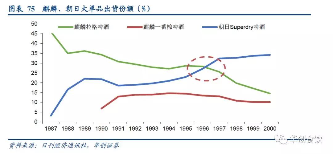 凭借Superdry优异表现,朝日市占率反超麒麟。1987年朝日推出超级单品Superdry,其清爽而刺激的口感迅速赢得消费者喜爱,当年出货量占整个啤酒市场3.2%,当时竞争对手麒麟大单品拉格出货量占啤酒市场46%,仍占据主流市场份额。1990年,Superdry出货量已占市场21.5%,拉格下滑到34.3%,此后麒麟推出一番榨以抗衡Superdry,然而一番榨并没有阻碍Superdry增长趋势,到2000年时Superdry出货量已占市场34.2%,而麒麟拉格与一番榨合计出货量只有24.6%。凭借Superdry单品成功,朝日啤酒市占率从1986年11%提升至2000年的46%,而麒麟则同期从60%跌落到34%。