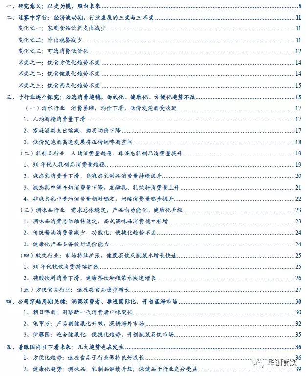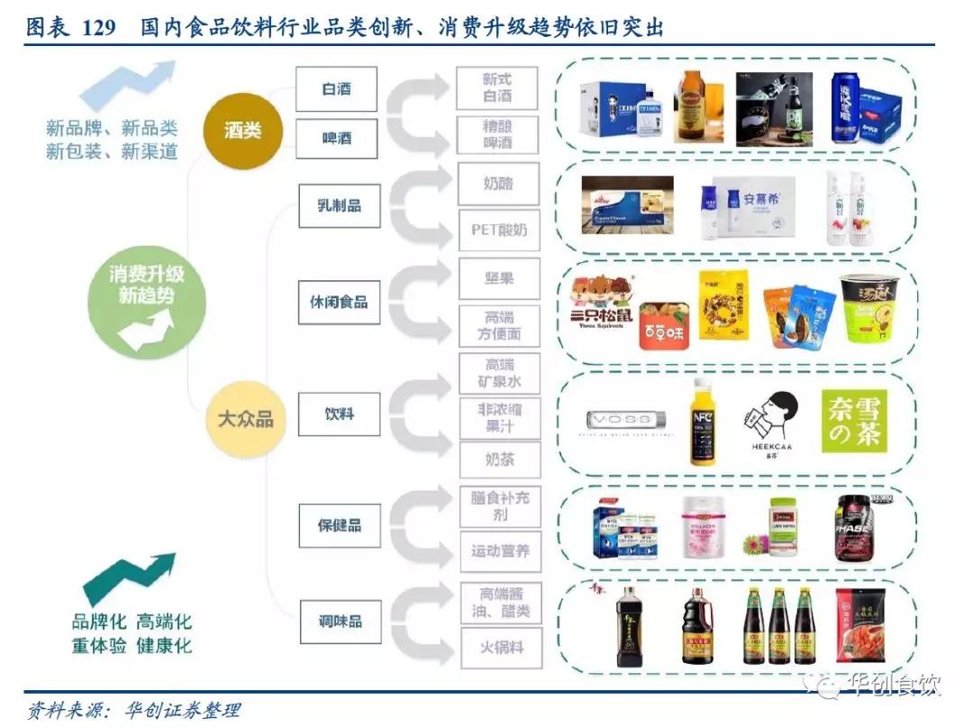 1)饮食方便化趋势下,速冻食品及复合调味料行业快速发展;2)健康化趋势下,调味品(酱醋有机零添加)、乳制品(有机/奶源地)、软饮(豆奶/气泡水)等相关产品继续升级,保健品行业充分受益;3)西式化趋势下,乳制品中黄油奶酪消费渐起,烘焙面包较快增长,酵母也随之受益;4)性价比趋势下,如近年来光瓶酒市场是典型代表,短保面包发展空间亦受益。展望未来,酒精饮料行业要积极关注年轻消费群体诉求,乳制品行业关注龙头海外布局和多元化拓展,调味品朝健康化升级仍是方向,软饮行业寻找符合健康趋势的爆款单品。