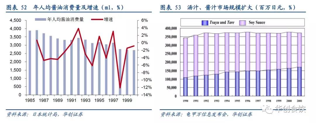 受饮食西式化影响,传统酱油消费量自80年代后期起有所下降,但功能化、便捷化的酱油衍生品如汤汁、酱汁消费量及市场份额则持续提升。根据龟甲万信息发布会资料显示,酱油类产品市场规模在90年代总体保持平稳,其中传统酱油份额有所萎缩,功能化的汤汁、酱汁份额持续扩大,可以看到,调味品消费的功能化、便捷化趋势并未被经济波动打断。
