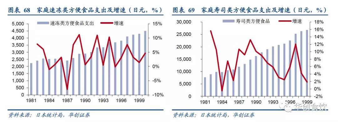 非主食类方便食品支出整体保持稳定,速冻类方便食品稳步增长。地产泡沫破裂后,居民外出就餐减少,部分回归家庭做饭,部分消费主食类及速冻方便食品。90年代期间,年家庭非主食类方便食品支出稳定在6万日元附近,而家庭主食类方便食品消费额从1990年2.3万日元提升到2000年的3.9万日元,CAGR为5.3%,高于整体方便食品消费额增速。主食类方便食品中,寿司类方便食品消费额持续增长,从1990年的1.6万日元提升到2000年的2.7万日元,CAGR为5.1%;速冻类方便食品消费额也从1990年的2908日元提升到2000年的4500日元,CAGR为4.5%。