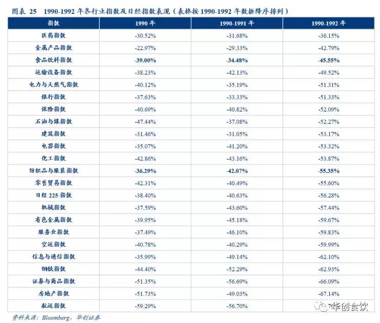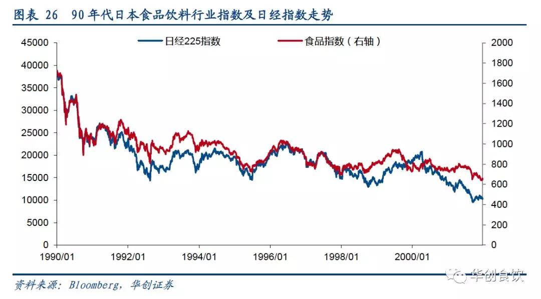 1)从市场表现来看:1990年泡沫破裂,日经指数大幅下滑,但医药、食品饮料、电器等消费板块表现跑赢指数,食品饮料板块排名第四。2)从子行业基本面来看:逐个探究发现,必选消费如乳制品调味品等总体趋稳,可选如酒类饮料有所下滑,多数子行业西式化、健康化、方便化趋势不改。3)从公司角度来看:在经济衰退期间穿越迷雾周期的公司有几类:第一,逐步开拓海外市场带来新增长点,如龟甲万深耕美国市场;第二,洞察消费者需求变化积极推出新品求变,如朝日啤酒推出清爽口感啤酒实现份额提升;第三,通过产品升级改造价值曲线,创造蓝海市场,如龟甲万创造健康酱油市场、伊藤园打开瓶装茶饮市场等。