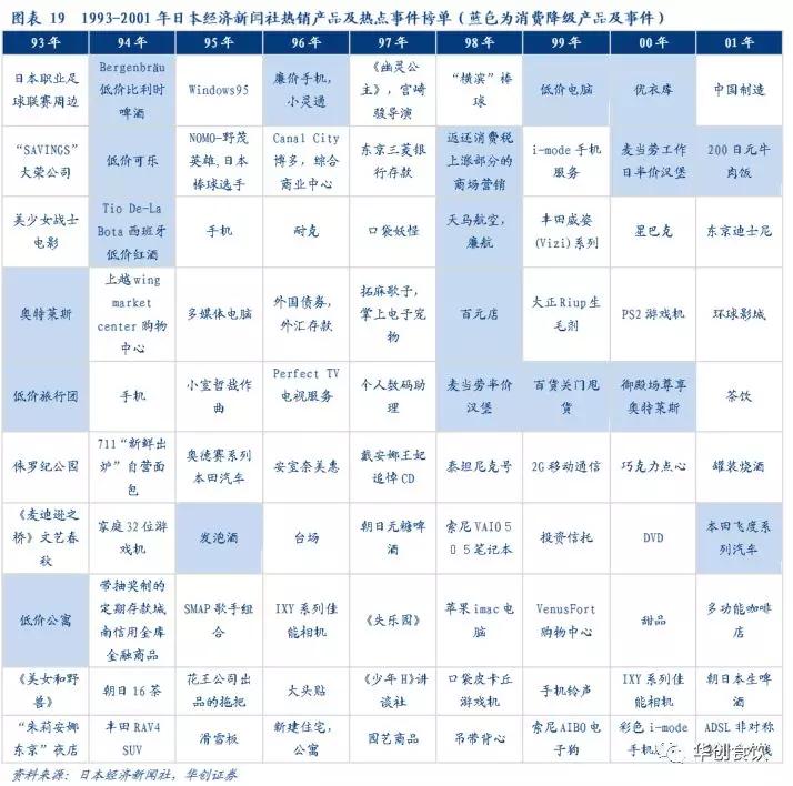 消费行为朝低价化发展,食品饮料行业中低价可选消费品受欢迎。在日本经济新闻社每年发布的热销产品及热点事件榜单中,我们看到,消费升级类产品多出现于泡沫破裂前,消费降级类产品多出现于泡沫破裂后。消费行为追求性价比或者说低价化也出现在食品饮料等日常消费中,在1993年-2001年的热销产品及热点事件榜单中,低价红酒、低价啤酒、半价汉堡、低价可乐和发泡酒皆有上榜。