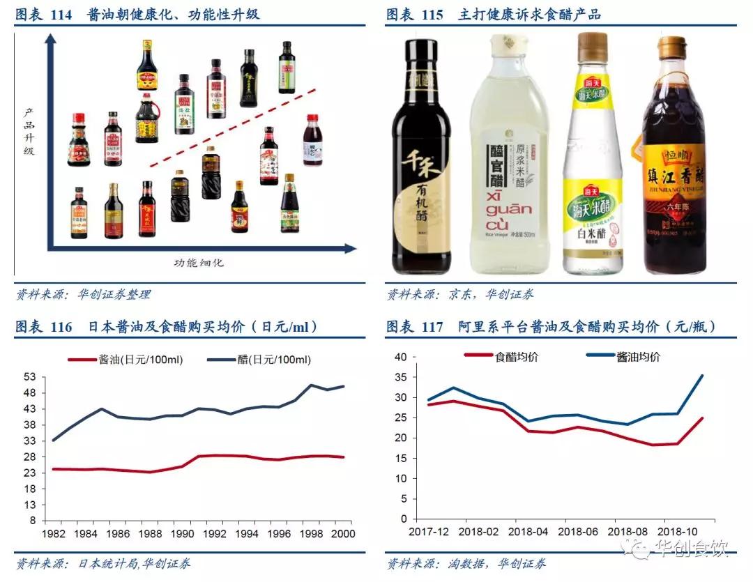 调味品消费健康化带动产品持续升级。主打功能性、健康性产品将是行业产品升级方向,酱油方面,老抽正逐步向生抽升级,一些中高端酱油品牌多使用非转基因大豆作为原料,氨基酸含氮量高于行业标准,同时根据消费者需求进行功能品类细分。醋类方面,不少品牌也推出主打健康或有机系列醋类产品,如恒顺高端产品三年陈、六年陈保持良好增速。此外,对标日本家庭食醋购买均价高于酱油,目前国内食醋主流价格不高,后续醋类产品预计仍有提升空间。