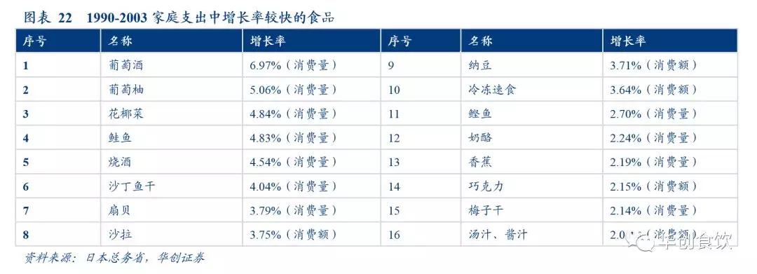 经济波动不改饮食健康化趋势,90年代增长较快产品多与健康、清淡相关。90年代前后食品饮料子行业多朝健康化方向升级,譬如酒精饮料朝低度化发展,酱油朝低盐、有机升级,碳酸饮料消费减少而无糖茶饮消费高速增长等(下文详细说明)。此外,日本90年代增长较快商品多与健康、清淡、低价相关,据日本总务省公开数据显示,1990-2000年家庭食品支出中增长率较快的食品有葡萄酒、花椰菜、巧克力、沙拉、烧酒、扇贝、沙拉、香蕉等,其中酒类产品为度数相对较低的品类,食品类产品多数与清淡、健康相关。