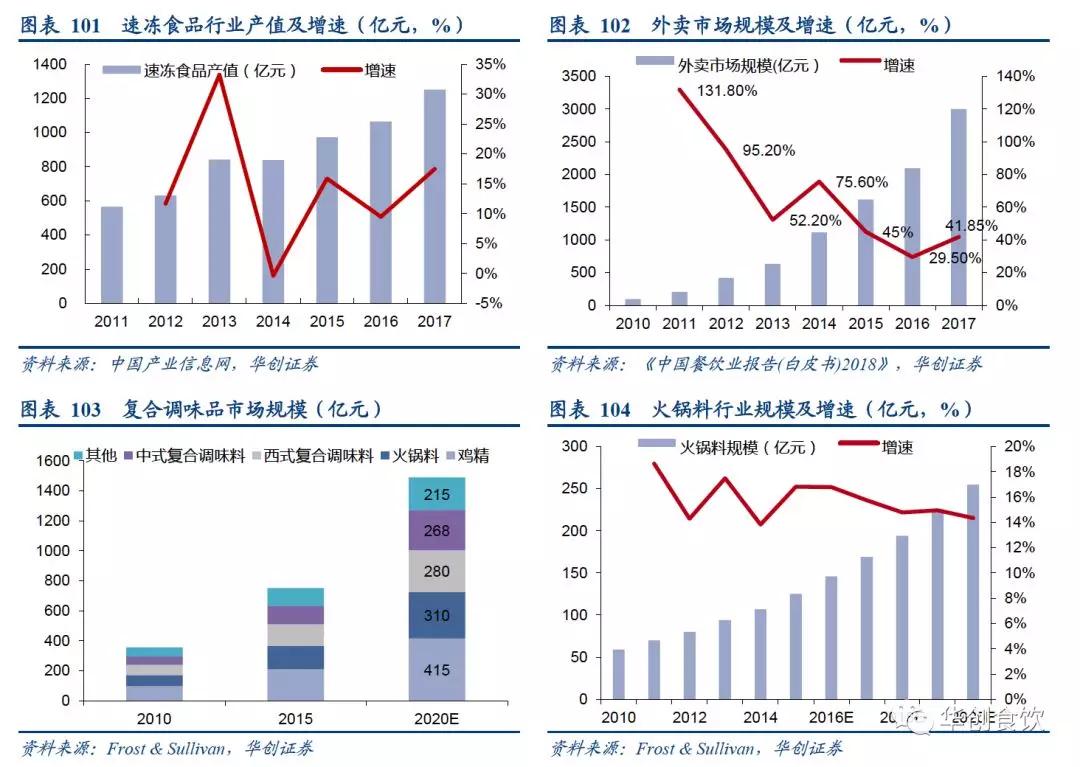 速冻食品、复合调味品受益,行业保持良好成长。受益于饮食便捷化需求提升、下游餐饮连锁化及消费场景扩充,速冻食品、复合调味品等子行业保持良好增长成为亮点。2017年中国速冻食品行业产值达1250亿元,2011-2017年CAGR达14.1%。根据Frost & Sullivan数据,2020年国内复合调味品市场规模预计接近1500亿元,2015-2020年均复合增长率约15%,其中火锅料市场规模2020年预计达255亿元,年均复合增长率约15%。此外,其他方便速食产品如自热小火锅等开始兴起,也拓宽了方便食品品类。