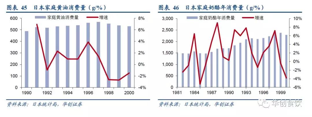 90年代日本年家庭黄油消费量稳定在500g附近,而奶酪消费量持续增长,从1990年1705g增长到2000年2286g。一方面饮食西式化并未被经济波动中断,黄油、奶酪消费量稳中有增。另一方面,居民健康意识增强,黄油和奶酪因其营养价值较高受到欢迎。