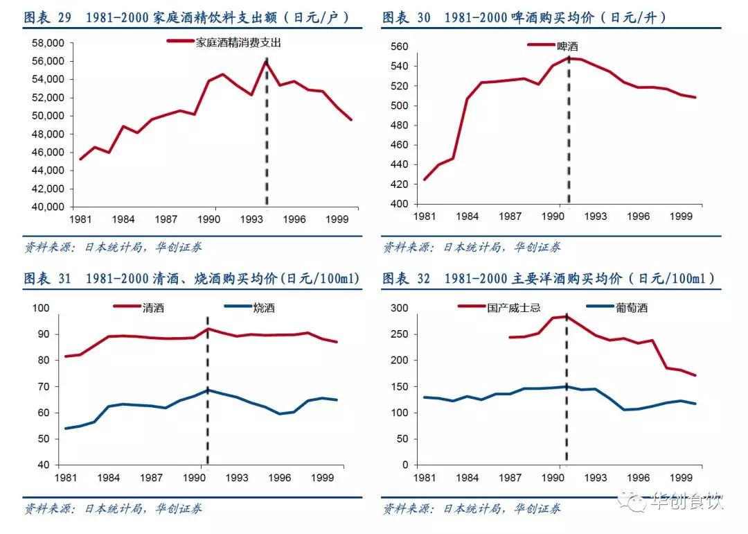 90年代家庭酒精饮料消费缩减,年支出额自1994年的5.6万日元下降至2000年的5万日元。分酒类来看,价格亲民的日本酒和啤酒购买均价下降5%-10%,价格较高的洋酒购买均价下降20%以上。受通缩环境及消费需求影响,1991年-2000年间,啤酒购买均价从548日元/升下降到508日元/升,降幅7.2%;清酒从92日元/100ml下降到87日元/100ml,降幅5.5%;烧酒从69日元/100ml下降到65日元/100ml,降幅5.4%;而价格相对较高的进口威士忌价格从1990年的576日元/100ml下降到2000年的341日元/ml,国产威士忌购买均价从284日元/100ml下降到172日元/100ml,降幅达39.5%,葡萄酒从150日元/100ml下降到117日元/100ml,降幅达21.8%。