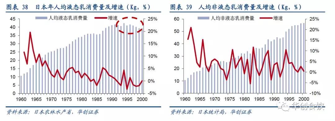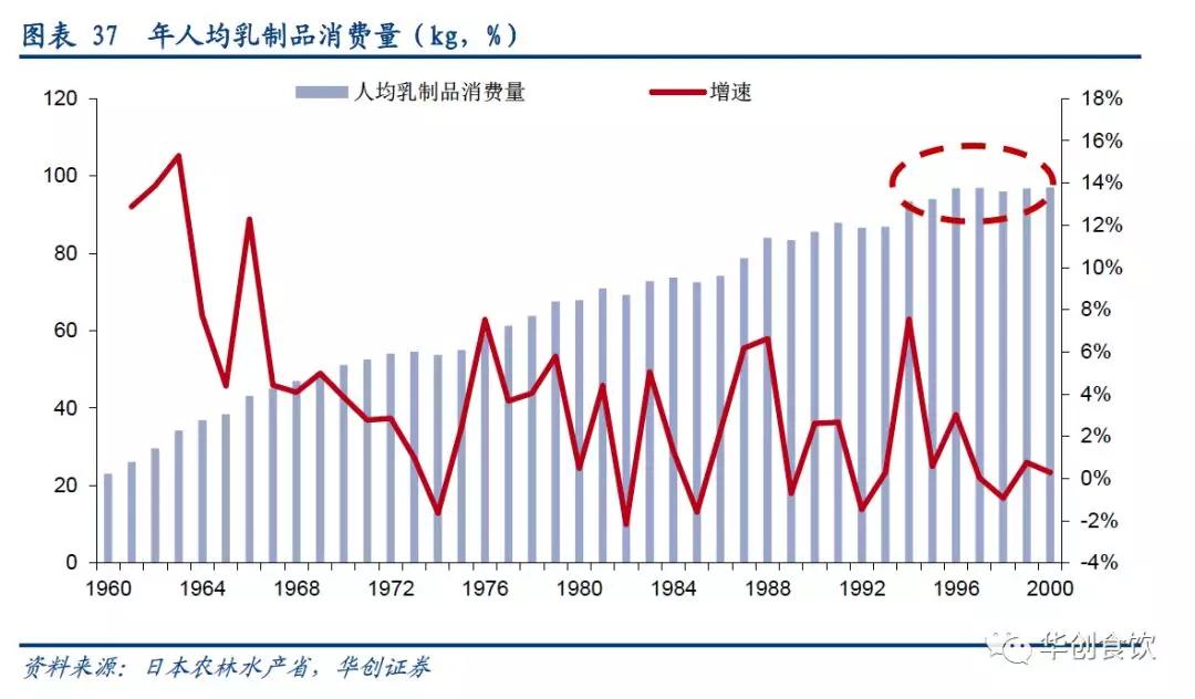 上世纪50年代中后期,日本政府颁布《学校午餐法》和《关于促进乳品业和养牛业的法令》并实施学生饮用奶计划,乳制品行业开始高速增长。70年代后随着西方饮食习惯在日本普及,人均乳制品消费量进一步提升。1960年—1996年,日本年人均乳制品消费量从23.1kg上升到96.8kg,CAGR为4.1%,此后日本人均乳制品消费量基本趋稳,维持在96kg左右。