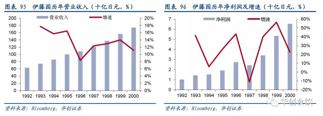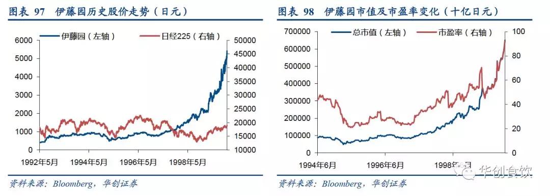 伊藤园业绩表现优异,市值稳步增长。1992-2000年间,伊藤园销售收入从629.7亿日元增长到1739.7亿日元,CAGR为13.5%;净利润从10.1亿日元增长到65.3亿日元,CAGR为26.3%,其市值从1994年的87.5万亿日元增长至1999年的652万亿日元,市盈率从1995年的低点21倍提升到1999年的高点92倍。