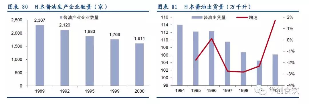 90年代日本传统酱油需求下滑,行业竞争激烈。受饮食西方化影响,90年代日本酱油需求下滑,行业竞争激烈,中小企业加速出清,酱油厂商数目从1989年的2307家下降到2000年的1611家,行业逐步集中。为应对国内传统酱油需求饱和的局面,酱油龙头龟甲万积极推动产品升级迎合健康化、方便化趋势,此外开始加大海外市场布局以开拓新的收入增长点。