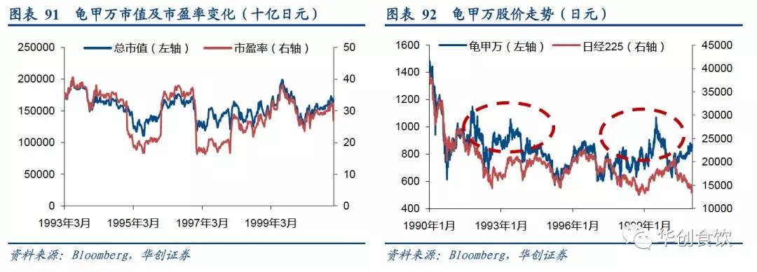 龟甲万业绩保持稳健,估值中枢接近30X。龟甲万90年代以来经营稳健,1990-1999年间,龟甲万收入从1969亿日元增长到1999年的2217亿日元,CAGR为1.3%;净利润从46.9亿日元增长到52.9亿日元,CAGR为1.4%。1992年-2000年间,龟甲万股价表现明显优于日经指数,估值在19-35倍之间波动,中枢接近30倍,总体保持相对稳定。
