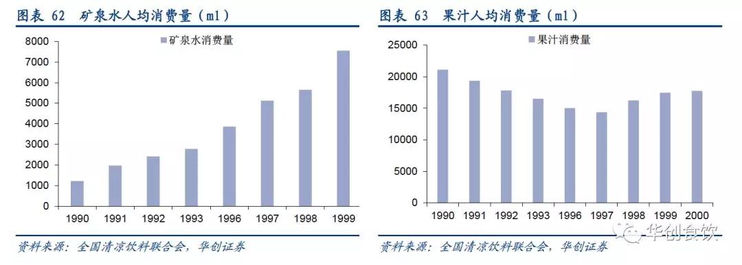 碳酸饮料消费量下降,无糖健康茶饮快速增长。随着90年代日本消费者健康意识增强,1990年-2000年,碳酸饮料人均消费量从24.2升下降到22.1升,果汁人均消费量从21.1升下降到17.8升,茶饮人均消费量则从11.5升提升至34.5升,CAGR为11.6%,瓶装水人均消费量从1.2升上升到7.5升,CAGR为 22.5%。