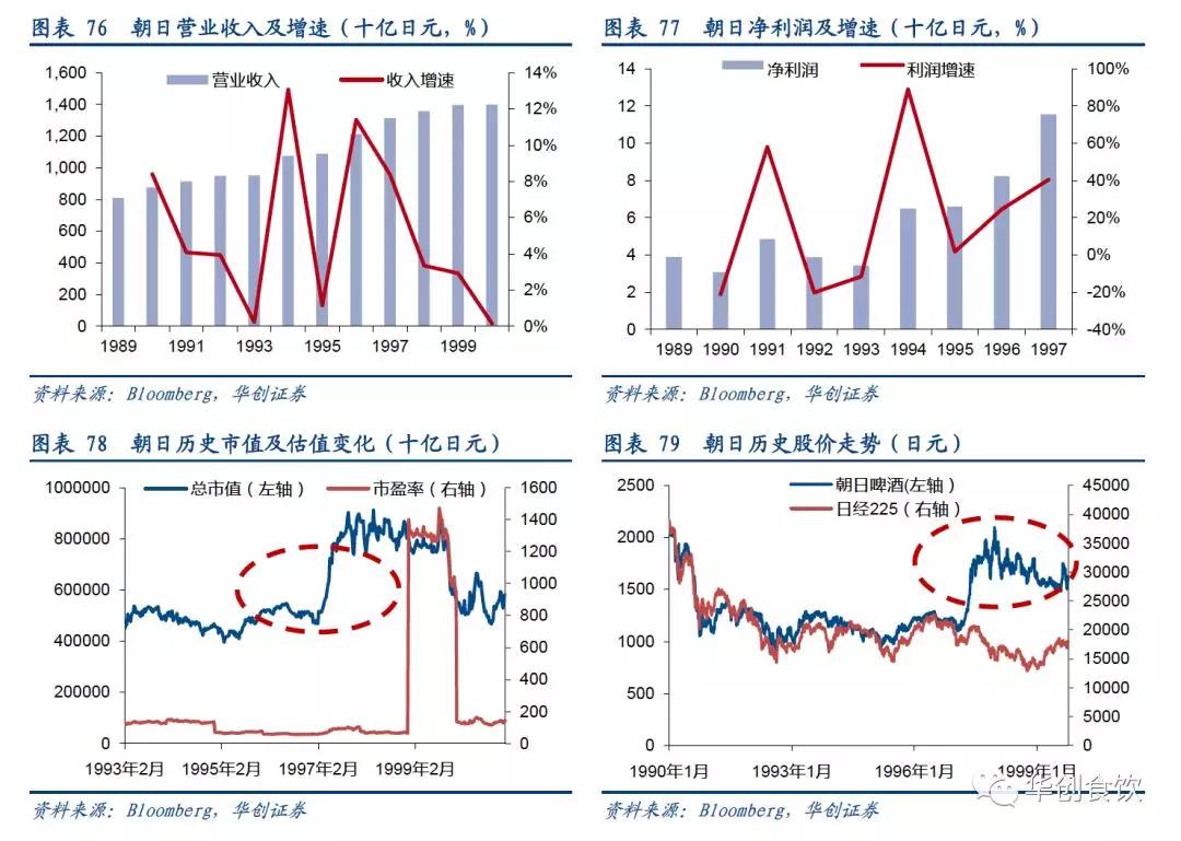 业绩增长稳健,市占率稳步提升,股价在90年代后期有明显超额收益。1990年-1997年间,朝日营业收入从8775亿日元增长到13133亿日元,CAGR为5.9%,净利润从31亿日元增长到116亿日元,CAGR为20.8%。在业绩持续增长,啤酒市占率稳步提升之下,朝日控股市值从1993年的451万亿日元增长至1997年的902万亿日元。
