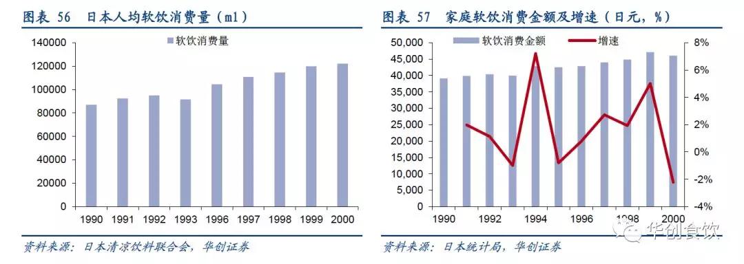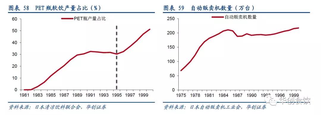 根据日本清凉饮料联合会数据统计,1990年-2000年人均软饮消费量从86.9升提升到122.1升,CAGR为3.5%,家庭软饮消费额从3.9万日元提升到4.6万日元,原因主要包括:1)90年代外企和日本啤酒大厂纷纷进入软饮行业,行业广告投入明显加大;2)500ml PET瓶生产放开,软饮消费更加便捷。80年代末日本因环保问题限制1升以下PET瓶产品生产,90年代中期日本容器包装处置相关法律出台,对未按规定处置容器的厂家和个人进行处罚,500mlPET瓶生产放开;3)自动贩卖机成熟拓宽消费购买场景;4)软饮行业新品开发力度加强,消费者选择更加多元化。