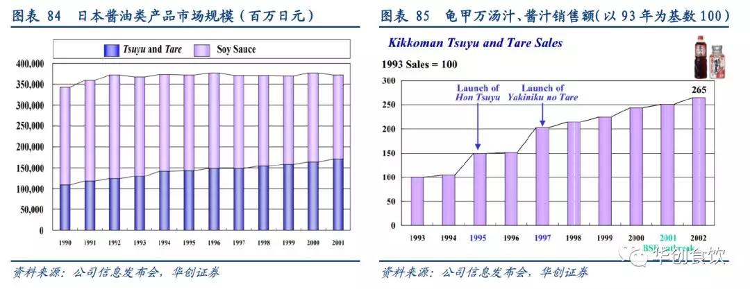 迎合消费者便捷化需求,积极开发功能性酱料。据公司信息发布会资料显示,1990年日本酱油类产品规模稳定在370亿日元附近,其中酱油产品占比从1990年2/3下降到2000年的1/2,而操作简便的汤汁、酱汁产品占比从1/3提升至1/2附近。在此期间,龟甲万抓住行业发展趋势,1992年及1995年推出两款汤汁产品,1997年及2000年推出两款酱汁产品,凭借四款产品实现功能性酱料销售额的快速增长。