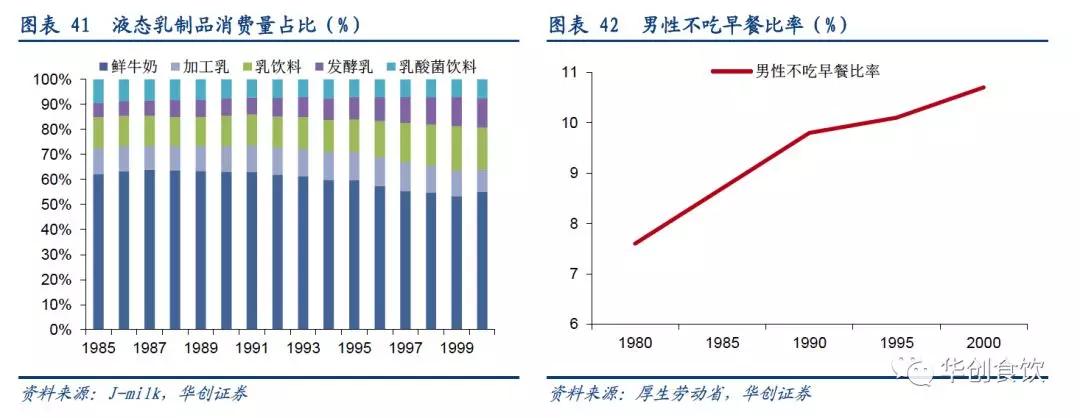 90年代期间,日本鲜牛奶消费量占液态乳消费量比重从1990年63.1%下滑到2000年的55.0%,乳饮料从12.1%上升到16.8%,发酵乳从6.9%上升到11.6%。该现象出现可能与三个因素有关:1)学龄人口的减少导致鲜奶消费群体下降,1990年至2000年,14岁以下人群占比从18.3%下降到14.6%;2)男性不吃早餐率提高使一部分消费者缺席鲜奶主要消费场景,其中1990年至2000年,男性不吃早餐率从9.8%提升到10.7%;3)鲜牛奶消费场景局限。鲜奶消费场景局限于用餐时段,而发酵乳、乳饮料即饮性更强,消费频次更高;4)乳制品消费由鲜奶向营养价值更高、风味更独特的发酵乳、乳饮料继续升级。