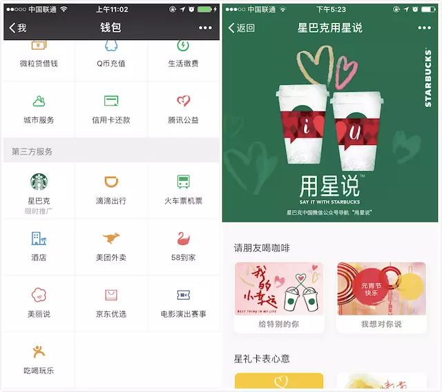 我们参考一下星巴克此前拥抱数字化的态度:2016年 12 月 8 日,星巴克宣布支持微信支付(有种说法是星巴克原本只打算与 Apple Pay 合作)。此间,张小龙曾强调,微信是“星巴克在数字创新领域的首选合作伙伴”。微信钱包还为星巴克单独开辟了一个入口,尝试社交玩法。