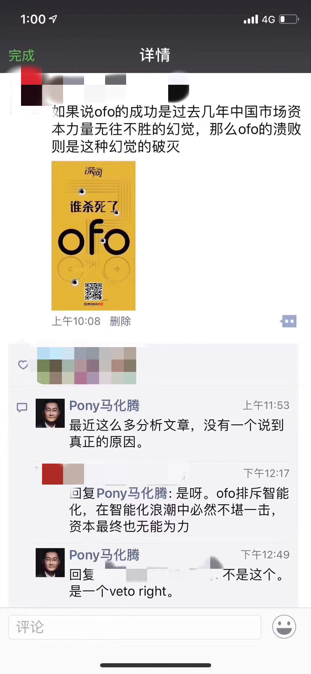 12月20日,马化腾在朋友圈对ofo溃败原因发表评论称,“是一个veto right(否决权)”的问题。