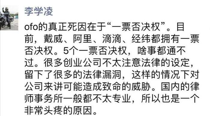 欢聚时代董事长兼CEO李学凌也在其朋友圈发出了相同的观点,称ofo真正的死因在于“一票否决权”。