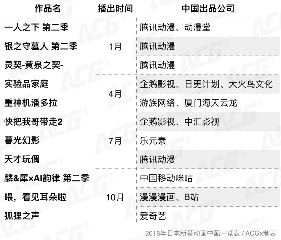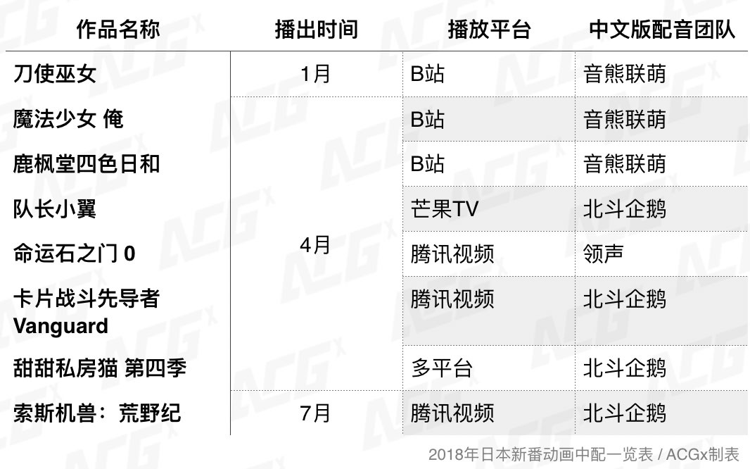 在2018年4月,很多中国的动漫爱好者都注意到了部分新番动画推出中配版的情况。据ACGx不完全统计,在2018年推出且具有中配版的新番动画,有以下几部: