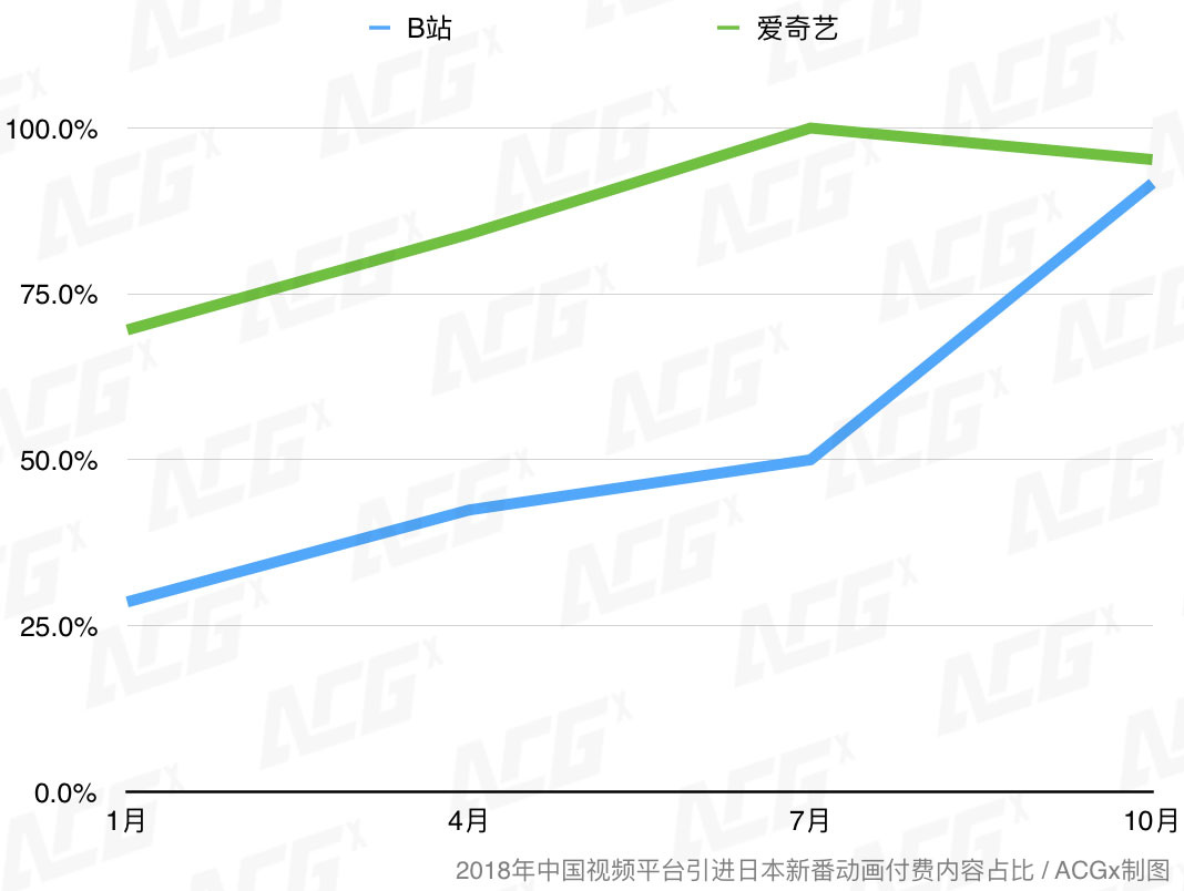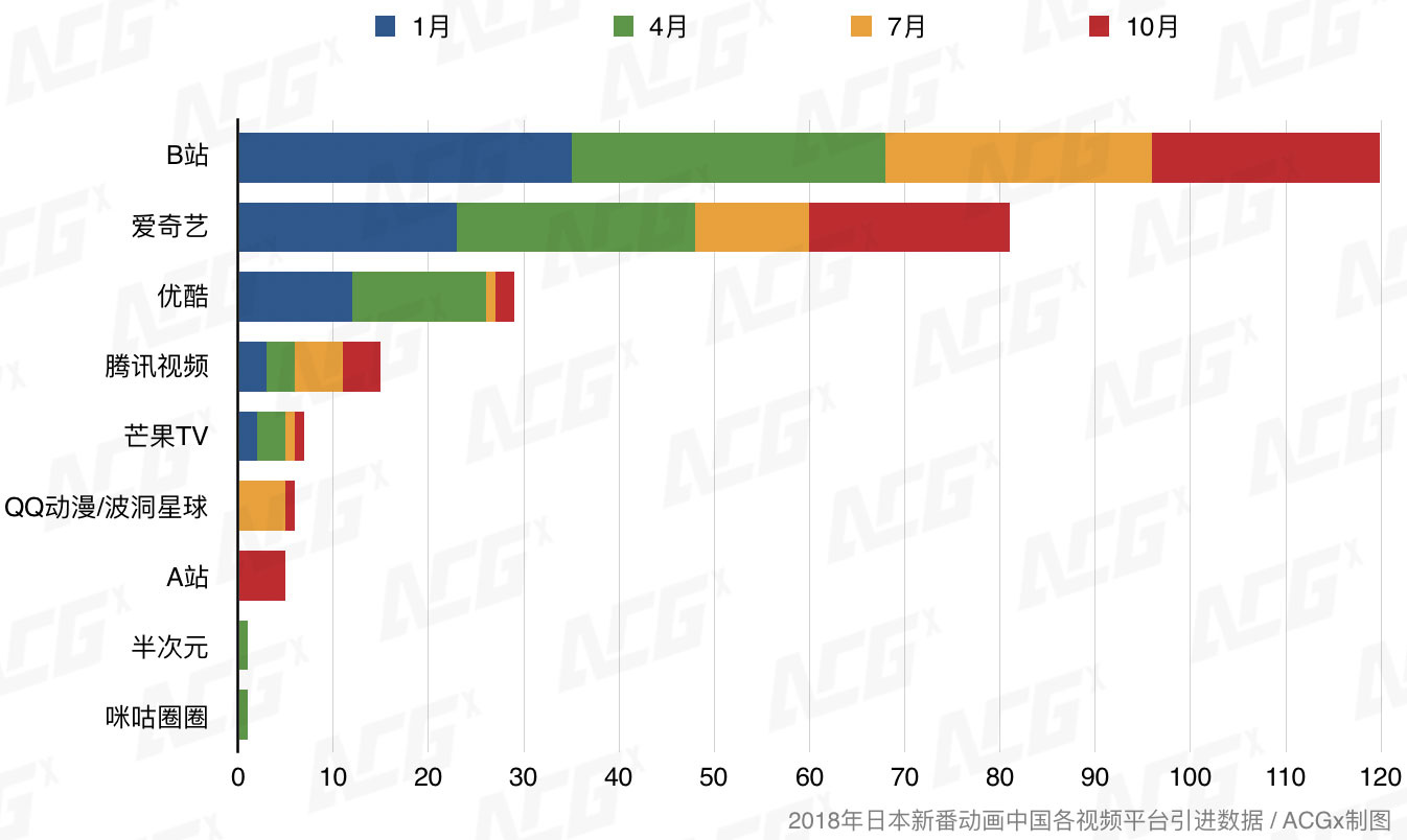 从上图中我们可以看到,B站、爱奇艺已经成为该市场领域的绝对主力,这两家视频平台加起来几乎覆盖了整个2018年的新番动画内容。