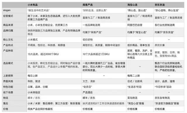 精品电商的SKU数则少得多:小米有品15个大类,超过2000个SKU;网易严选10个大类,超过1万个SKU;淘宝心选和京东京造还在早期,SKU数就更少了。